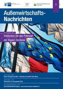 Inhalt Weltweit erfolgreich 3 Entdecken Sie das Potenzial der Region Occitanie 6 Essen verändert die Welt 8 Handelsvolumen Sachsens mit bedeutenden Weltregionen 2023 10 WFS bietet verschiedene Projekte zur Erschließung europäischer Märkte an 12 Kommentar zur Europawahl 2024 Veranstaltungen, Weiterbildungen und Messen 13 Markt- und Länderveranstaltungen 13 Online-Weiterbildungsangebote für die Außenwirtschaft 13 Präsenz-Weiterbildungsangebote für die Außenwirtschaft 14 Messen und Unternehmerreisen Zoll- und Außenwirtschaftsrecht 16 Länderinformationen Geschäftsverbindungen 18 Aktuelle Kooperationsangebote ausländischer Unternehmen Tipps für die Außenwirtschaftspraxis 24 Der präferenzielle Ursprung – was ist das und wie entsteht er? 26 Ansprechpartner | Impressum SACHSEN! Weltweit dabei. Außenwirtschaftstag Sachsen 11. April 2024 | Sächsische Aufbaubank Leipzig Global vernetzt & digital erfolgreich © fotolia.com – sdecoret, pillerss 2 Außenwirtschaftsnachrichten 2 | 2024