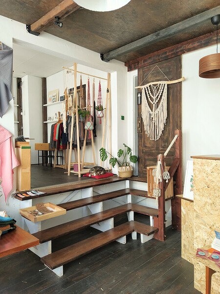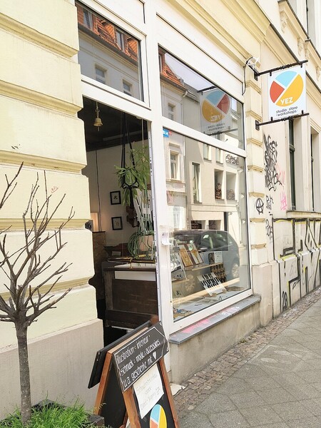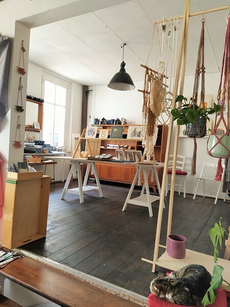 Gemeinsam nutzen wir den Ladenbereich (2 verbundene Verkaufsräume: einer mit großem Schaufenster), wo wir unsere eigenen Produkte - Prints, (Wohn)Accessoires, Schmuck - verkaufen.