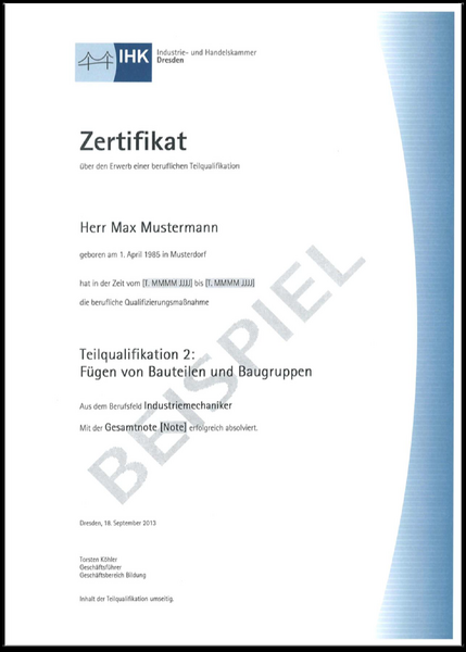 Nach erfolgreich abgelegter Kompetenzfeststellung erhält der Teilnehmer von der IHK ein individuelles Zertifikat (Muster Anlage 3).